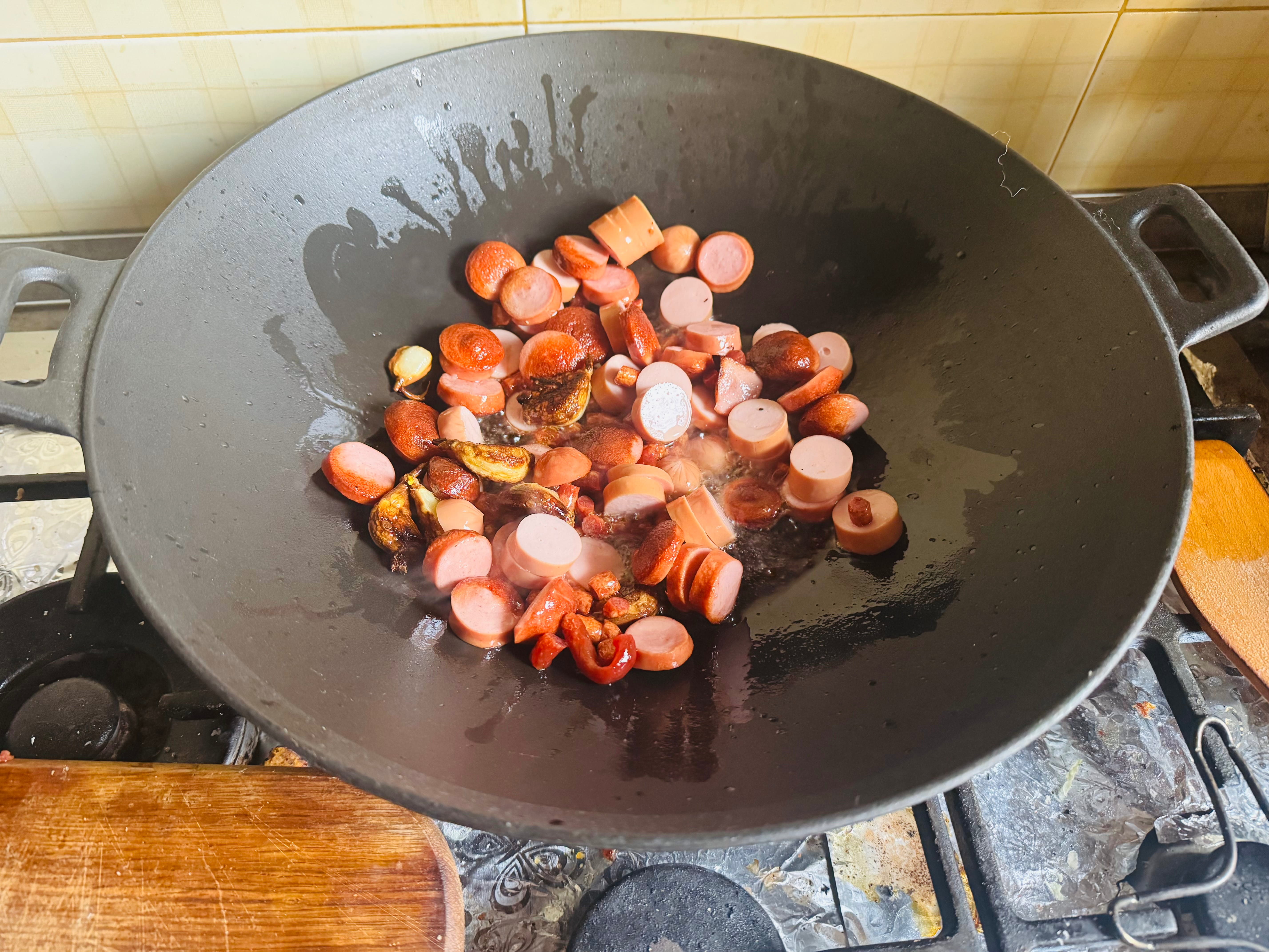 Додайте нарізані ковбасні вироби. Обсмажте до рум'яної скоринки, потім вийміть шумівкою і відкладіть разом з часником.