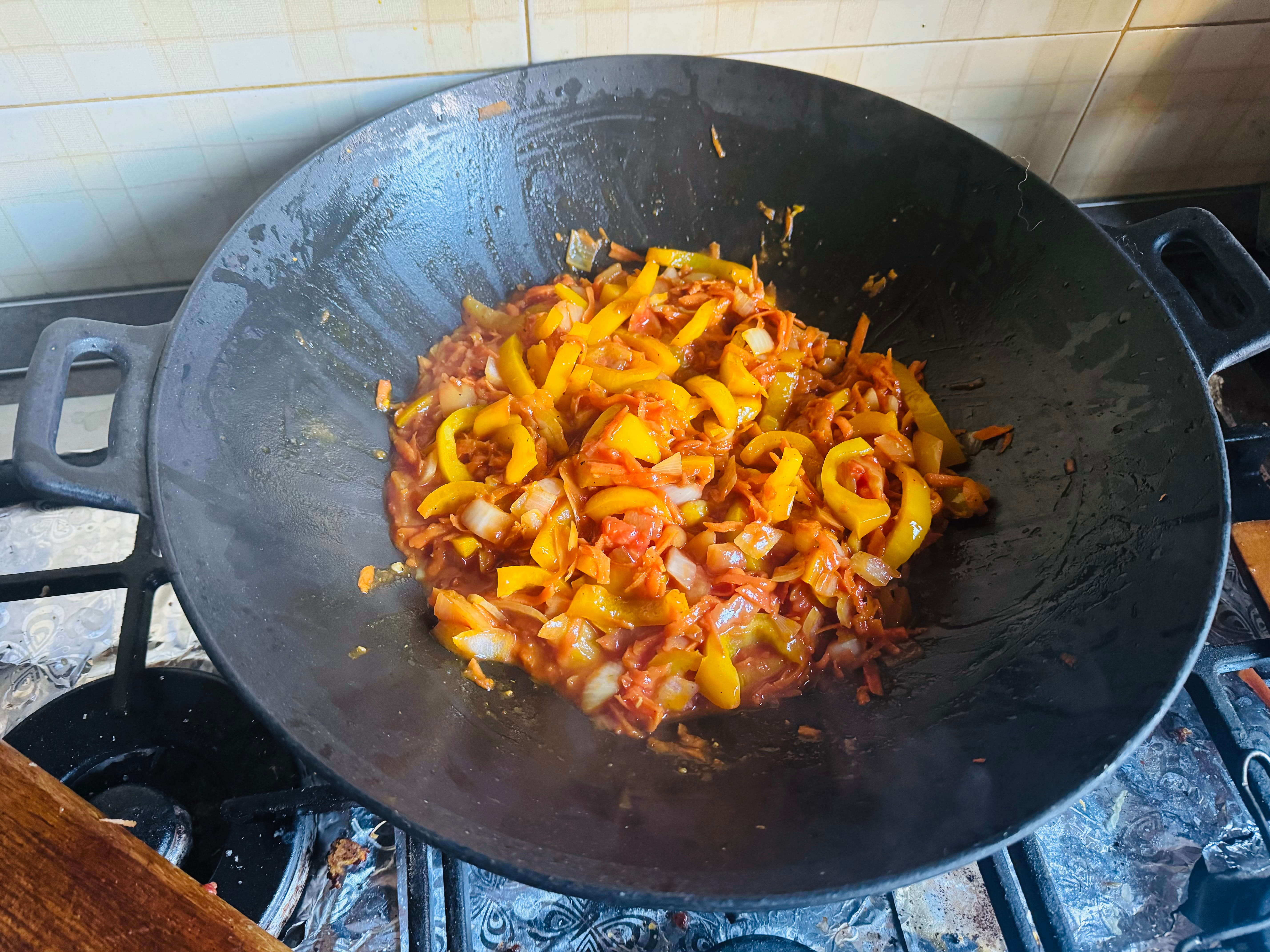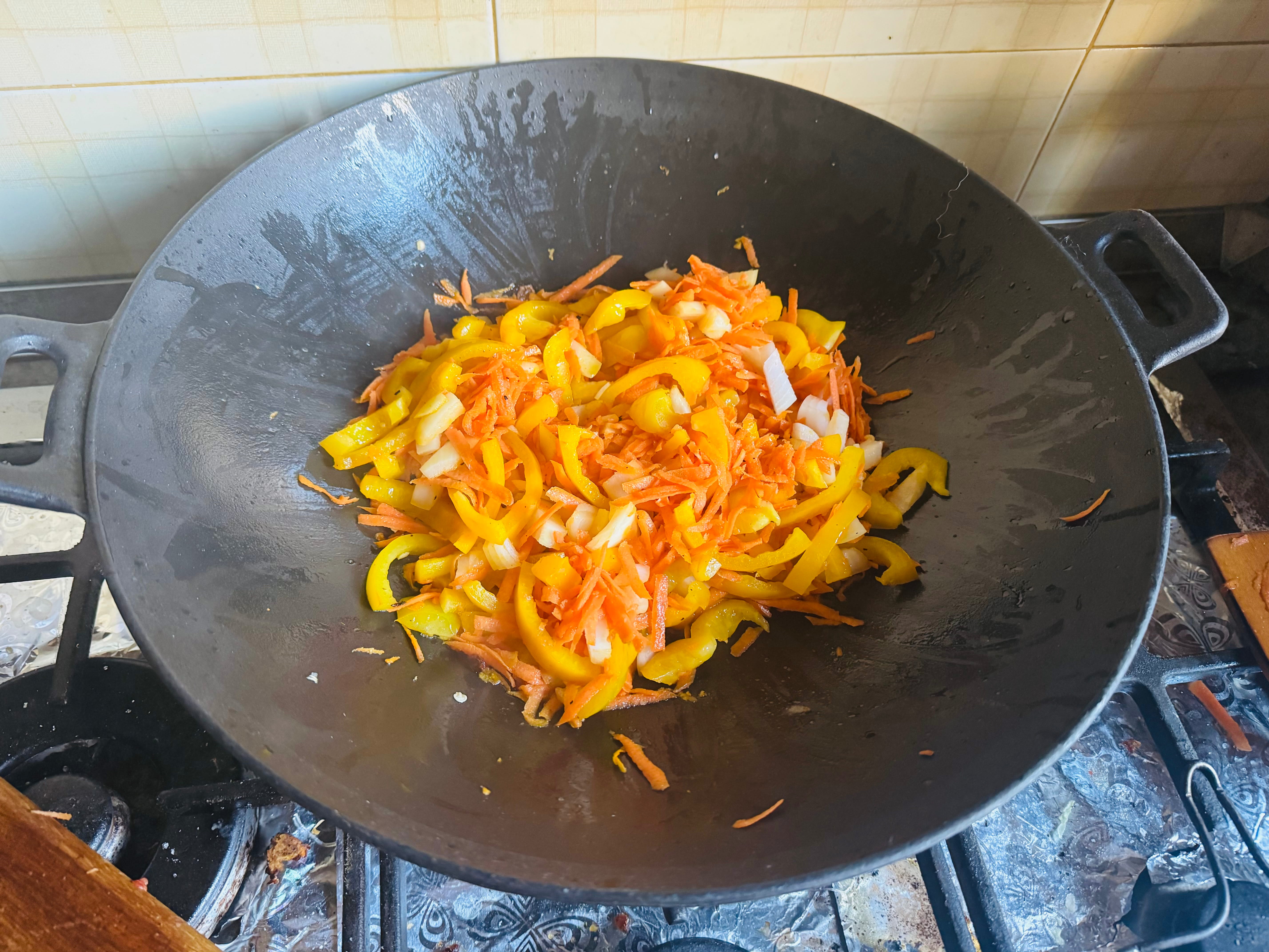У тому ж маслі обсмажте жовтий болгарський перець до м'якості. Додайте натерту моркву і нарізану цибулю. Готуйте, помішуючи, поки овочі не стануть м'якими і ароматними.
